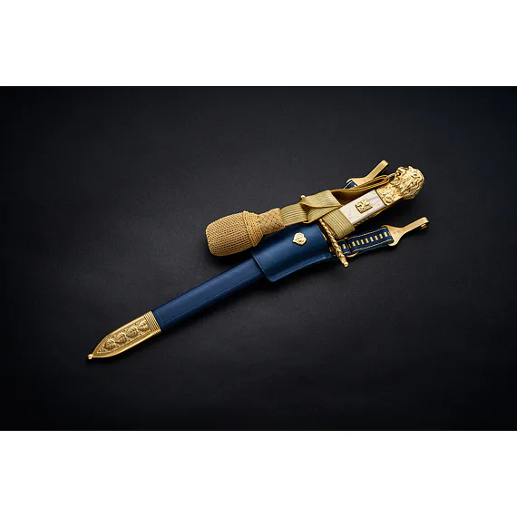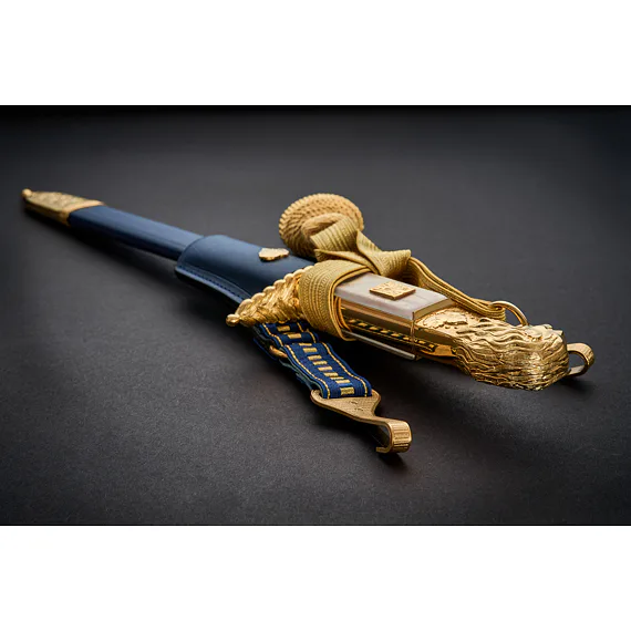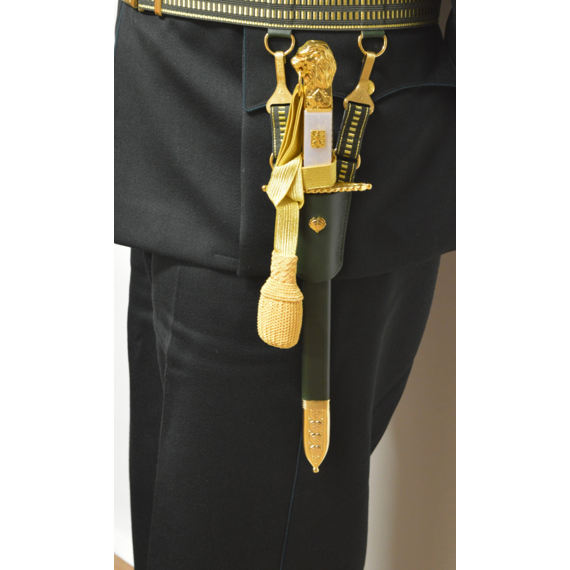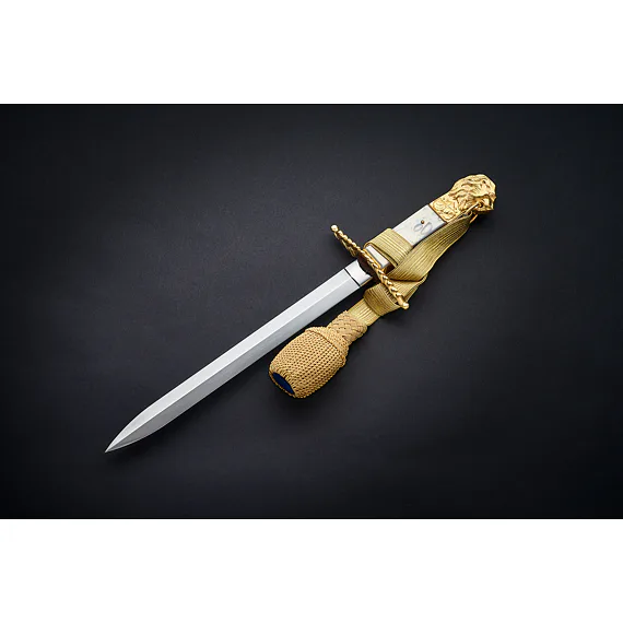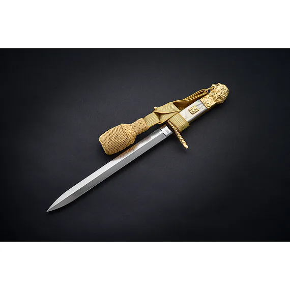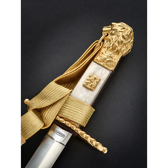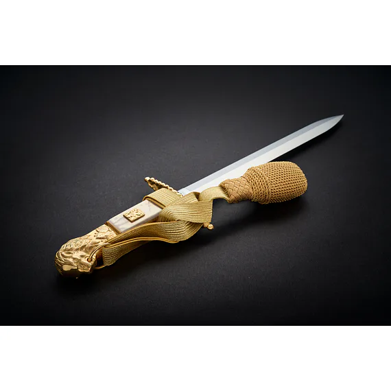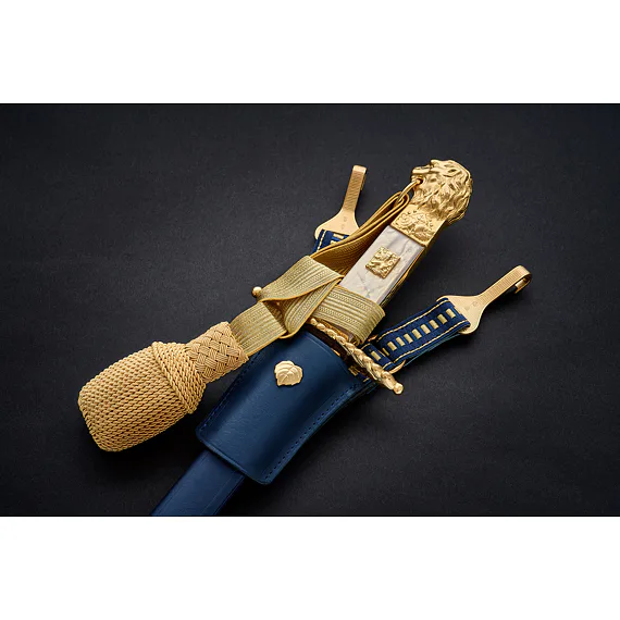 The hilt is cast from brass, then chiseled (that is, manually adjusted with a spade) and then gilded. The lower guard is straight. From the top, it resembles the shape of an oval. The center of the part is inlaid on both sides of the mother-of-pearl, where a gilded Czechoslovak coat of arms measuring 12 x 15 mm is inserted from the front side and the handle is riveted on the other side. Only in the case of the lion are the inserted handles still attached on both sides at the top and bottom by overlapping gold plates. The upper part of the hilt is then finished on both sides with an engraving of linden leaves, above which is dominated by a beautifully elaborated lion's head with a mane and a ring in the mouth used to thread the tassel. The removable lion's head is glued with screws on some gladioli, whether in the design of a lion or a lioness. diamond-shaped with a slightly raised longitudinal central point. The tip of the blade has a gradual arching of the blade and the rickshaw is smaller with this blade than, for example, with flight cords, where the blade is similar in shape and design.