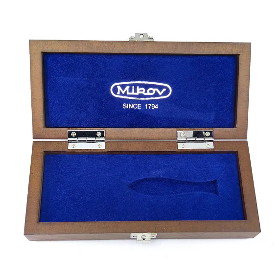 The wooden gift box 130 is suitable for traditional Rybička knives, which are manufactured by our company Mikov Mikulášovice. The blue inner lining is complemented by silver-colored decoration