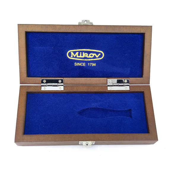 The wooden gift box 130 is suitable for traditional Rybička knives, which are manufactured by our company Mikov Mikulášovice. The blue inner lining is complemented by gold-colored decoration