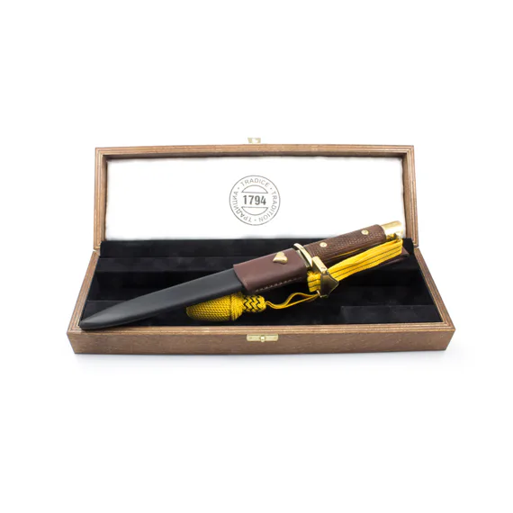 Each knife has its own unique serial number 1 - 200. For the knife blade we used AISI 420 stainless steel. A brass alloy was used to make the fittings, the coat of arms and the front of the sheath. A steel and cowhide were used for the sheath.Its surface finish is matte black. The knife is delivered in a padded wooden box. Each knife has a certificate of originality. A part of this numbered editions of Commissioned officer's knife M - 1917 is also a publication with additional information about the history of these weapons, the factories in which they were manufactured and the soldiers who used it.