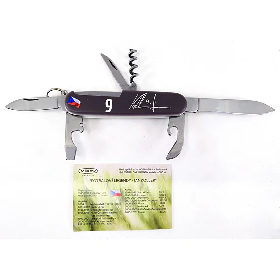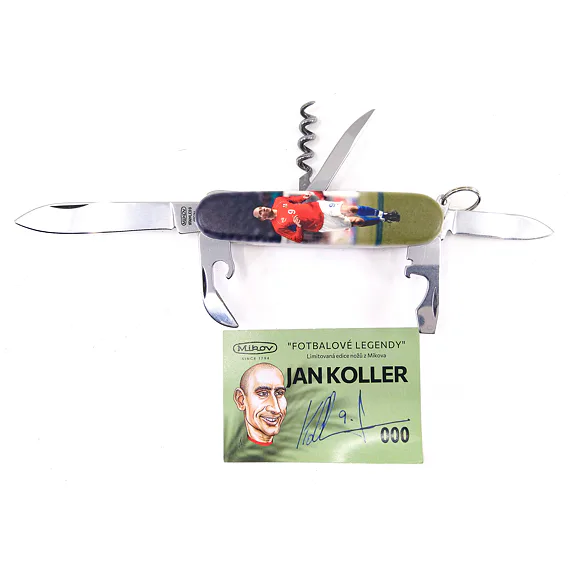 Jan Koller je dodnes nejlepším střelcem národního týmu za který odehrál 91 zápasů a vstřelil 55 gólů. Právem mu patří místo v klubu ligových kanonýrů kdy v nejvyšších soutěžích nastřílel 180 branek. Hrál v několika zemích a vyhrál několik titulů a pohárů. V roce 1999 se stal nejlepším fotbalistou ČR. Na čelní straně nože najdeme stejně jako u předchozích dvou sériích, fotografii hráče v jeho nejlepších letech v reprezentačním dresu. Zadní stranu jsme vyrobili ve spolupráci s hráčem (Jan Koller), kde je jeho číslo dresu 9 a vlastnoruční podpis společně s českou vlajkou, která znázorňuje jeho reprezentační období.