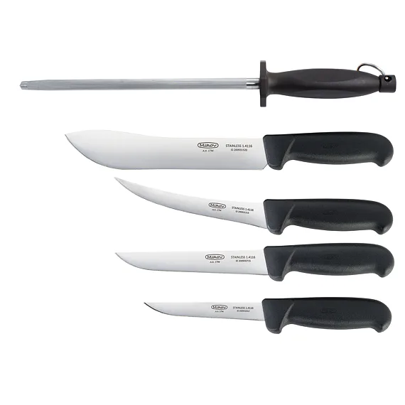 Nože jsou certifikovány pro styk s potravinami dle norem EU. Sada řeznických nožů je vyrobena z kvalitní nerezové oceli, kterou doplňuje držadlo z kvalitního tvrdého plastu, které umožňuje komfortní a bezpečný uchopení nože.