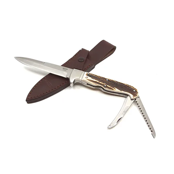 The dagger handle, which conceals the saw and the down blade is made of genuine deer antler.