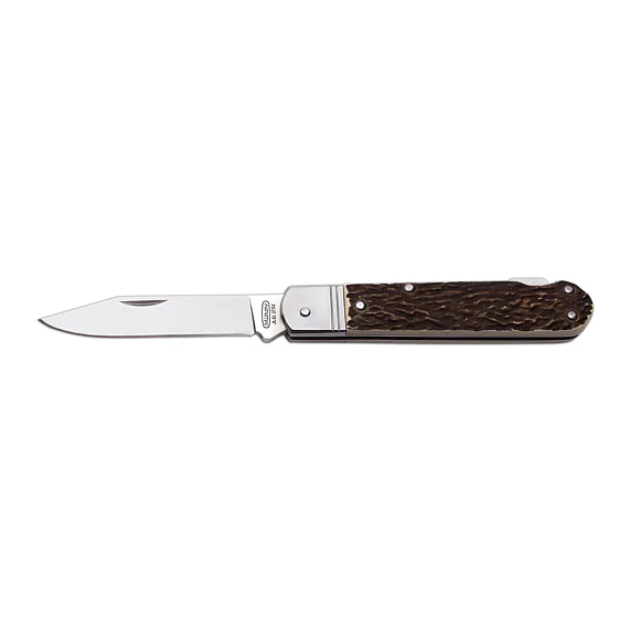 Hunting knife FIXIR is equipped with a blade of high quality stainless steel 440A with a hardness of 56HRc. The blade of the hunting knife FIXIR has a conical cut, which allows not only better cutting, but also maintenance. Hunting knife FIXIR is equipped with a backlock for greater safety when working with the knife. Handles of FIXIR hunting folding knife are made of high quality antler imitation. Hunting knife FIXIR is supplied with a leather case with the Mikov logo and is packed to a gift box.