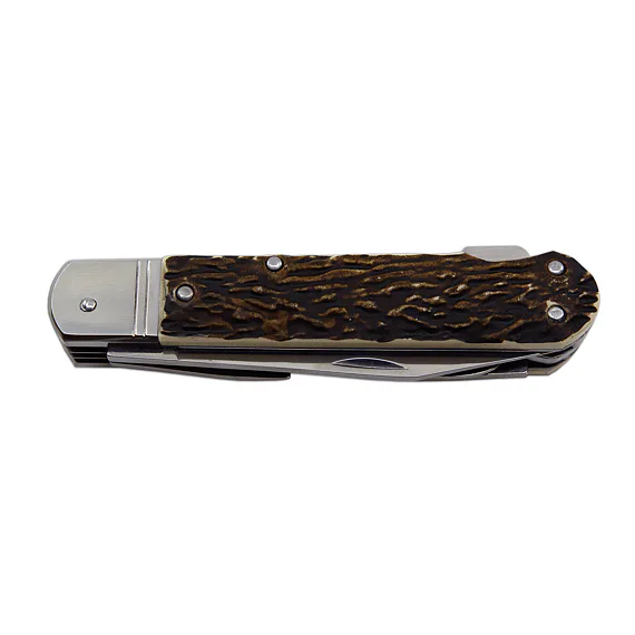 Hunting knife FIXIR is equipped with a blade of high quality stainless steel 440A with a hardness of 56HRc. The blade of the hunting knife FIXIR has a conical cut, which allows not only better cutting, but also maintenance. This type of hunting knife FIXIR is also equipped with a quality saw with two rows of teeth, Can opener and bottle opener, which can also be used as a flat screw-driver. Hunting knife FIXIR is equipped with a backlock for greater safety when working with the knife. Handles of FIXIR hunting folding knife are made of high quality antler imitation. Hunting knife FIXIR is supplied with a leather case with the Mikov logo and is packed to a gift box.