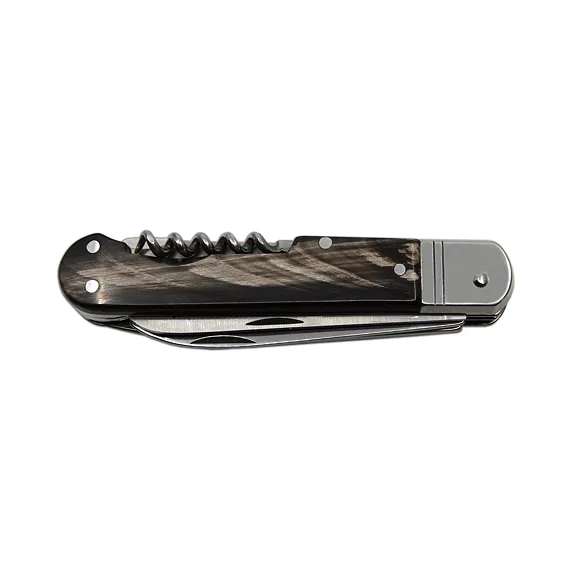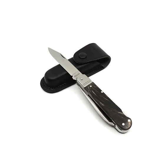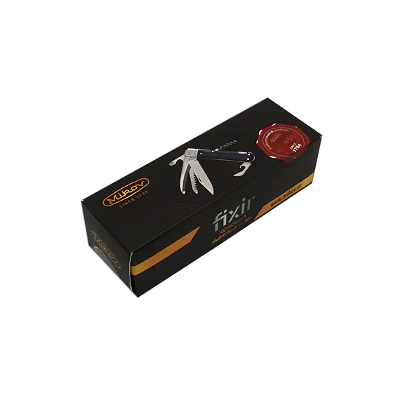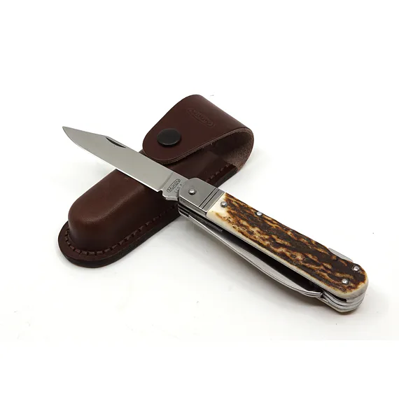 Hunting knife FIXIR is equipped with a blade of high quality stainless steel 440A with a hardness of 56HRc. The blade of the hunting knife FIXIR has a conical cut, which allows not only better cutting, but also maintenance. This type of hunting knife FIXIR is also equipped with a quality saw with two rows of teeth, down blade and a corkscrew. Hunting knife FIXIR is equipped with a backlock for greater safety when working with the knife. Handles of FIXIR hunting folding knife are made of real deer antler. Hunting knife FIXIR is supplied with a leather case with the Mikov logo and is packed to a gift box.