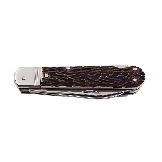 Hunting knife FIXIR is equipped with a blade of high quality stainless steel 440A with a hardness of 56HRc. The blade of the hunting knife FIXIR has a conical cut, which allows not only better cutting, but also maintenance. This type of hunting knife FIXIR is also equipped with a quality saw with two rows of teeth, down blade, can opener, bottle opener which can also be used as a flat screw-driver and a coekscrew. Hunting knife FIXIR is equipped with a backlock for greater safety when working with the knife. Handles of FIXIR hunting folding knife are made of high quality antler imitation. Hunting knife FIXIR is supplied with a leather case with the Mikov logo and is packed to a gift box.