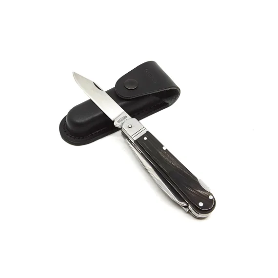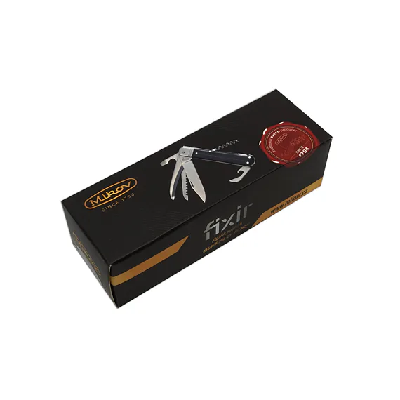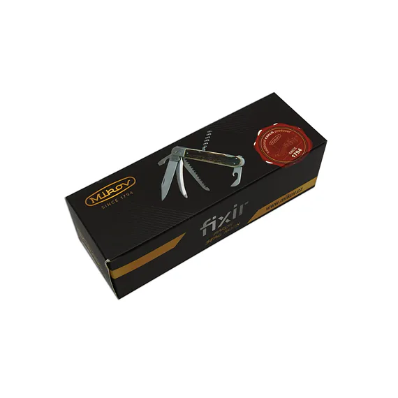Hunting knife FIXIR is equipped with a blade of high quality stainless steel 440A with a hardness of 56HRc. The blade of the hunting knife FIXIR has a conical cut, which allows not only better cutting, but also maintenance. This type of hunting knife FIXIR is also equipped with a quality saw with two rows of teeth, down blade, can opener, bottle opener which can also be used as a flat screw-driver and a coekscrew. Hunting knife FIXIR is equipped with a backlock for greater safety when working with the knife. Handles of FIXIR hunting folding knife are made of real deer antler. Hunting knife FIXIR is supplied with a leather case with the Mikov logo and is packed to a gift box.