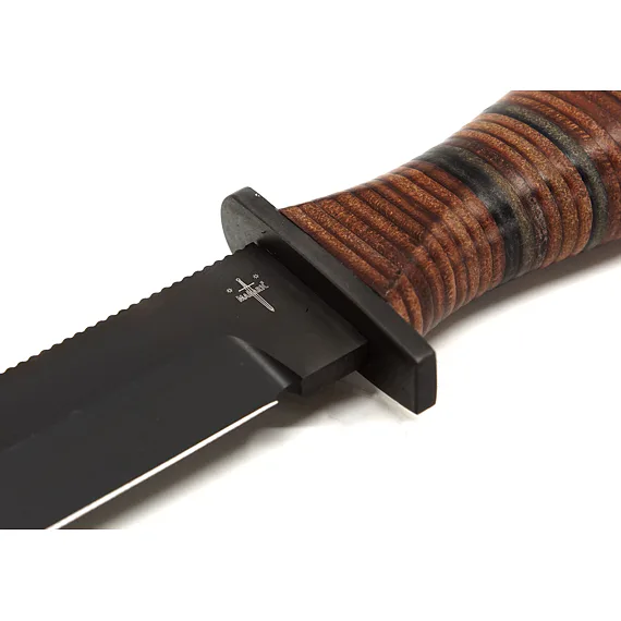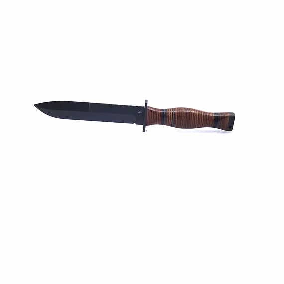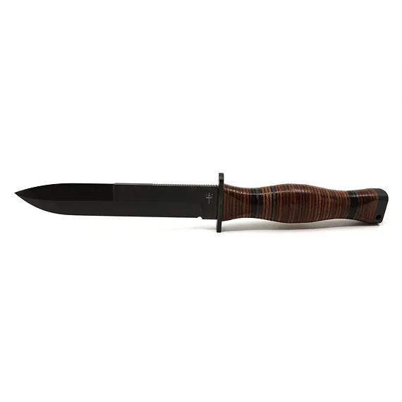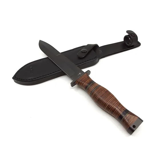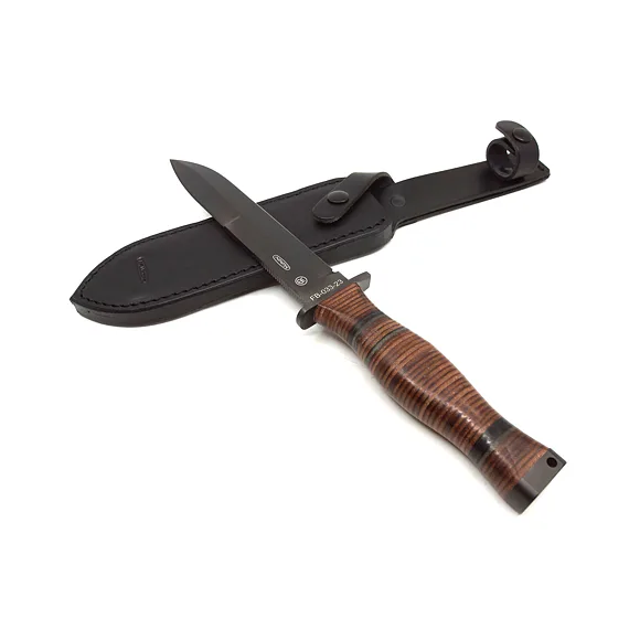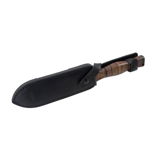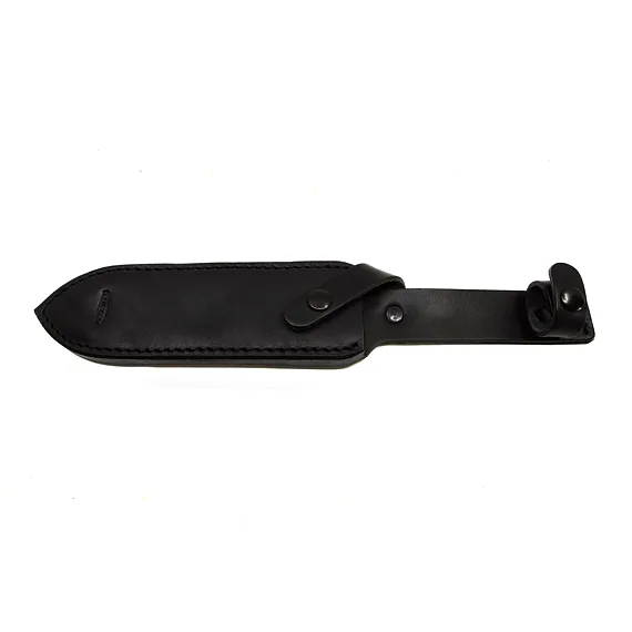 Handle made of oval rings. Head with hole for hanging cord. The FALCO knife comes with a black leather sheath.