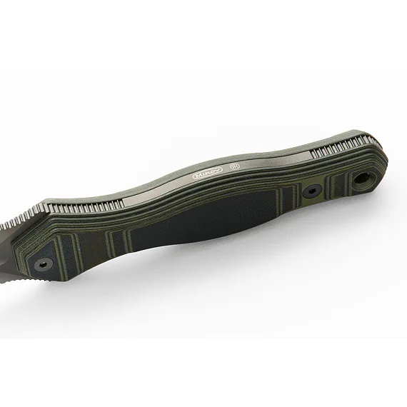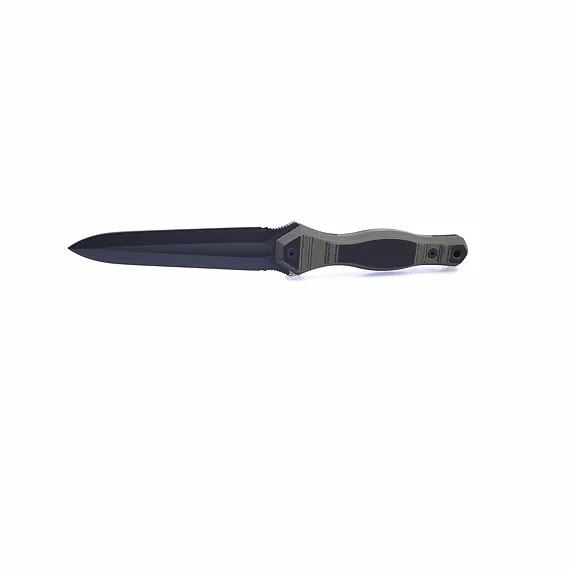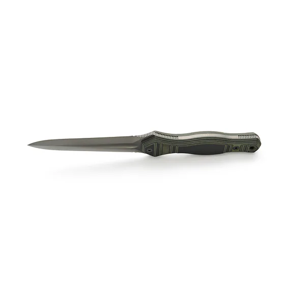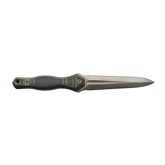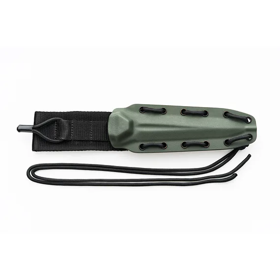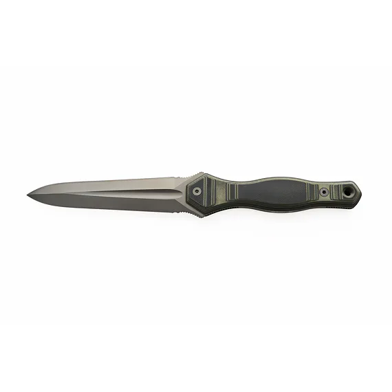 The blade is made from N690 steel with a hardness of 58-60 HRc. The dagger is double-edged and the surface of the handle is roughened for a safe grip and easier handling. The packaging includes a kydex sheath with a fabric loop and securing cord.