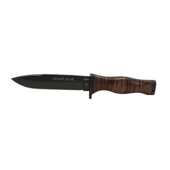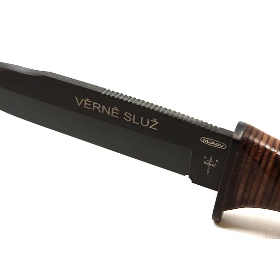 On the left side of the blade text: FAITHFUL SERVICE, logo MIKOV, logo MAĎARIČ. On the right side of the blade N690, PM-20-XXX. X = serial number of the knife.