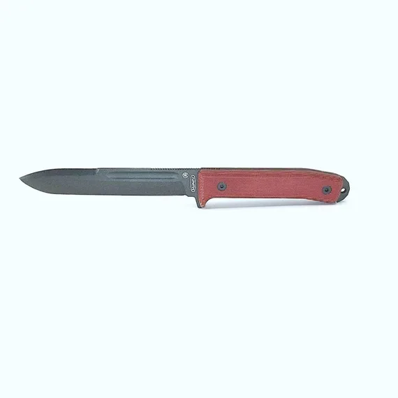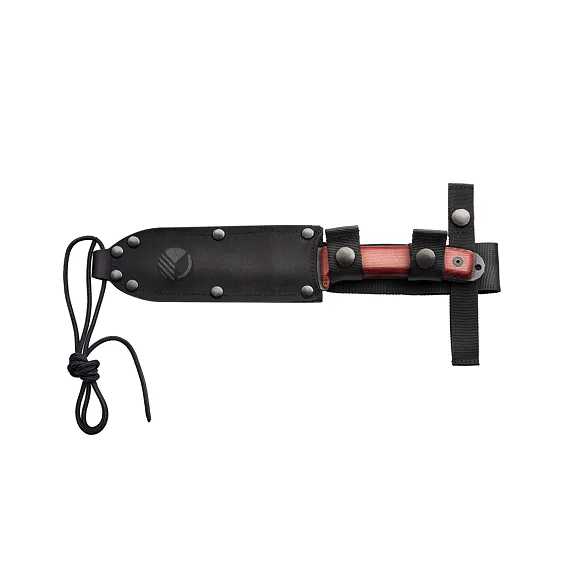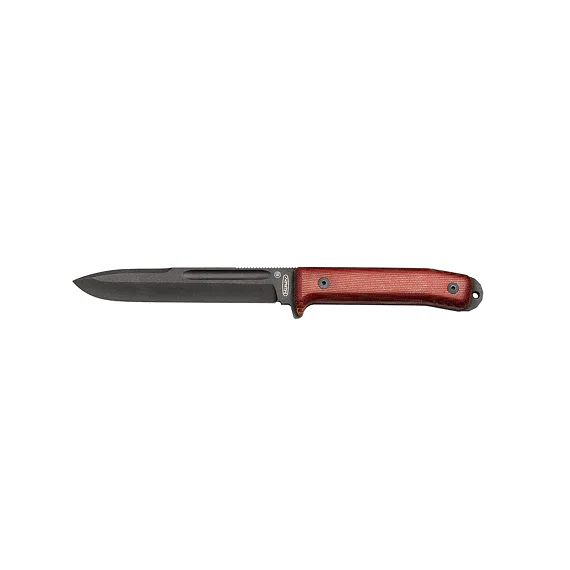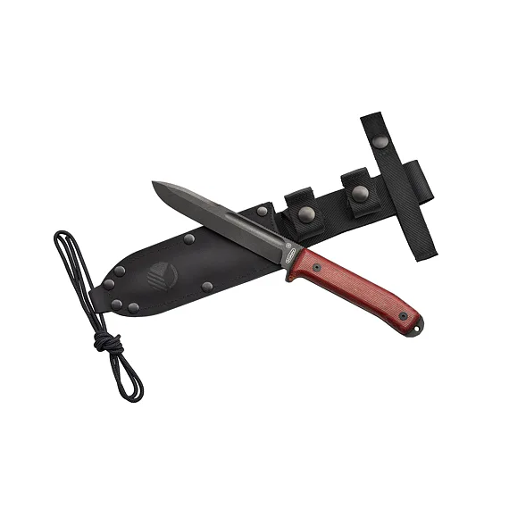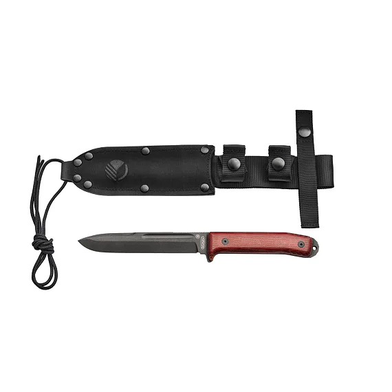 REPETITOR is an integral knife with red attachments made of Micarta material.