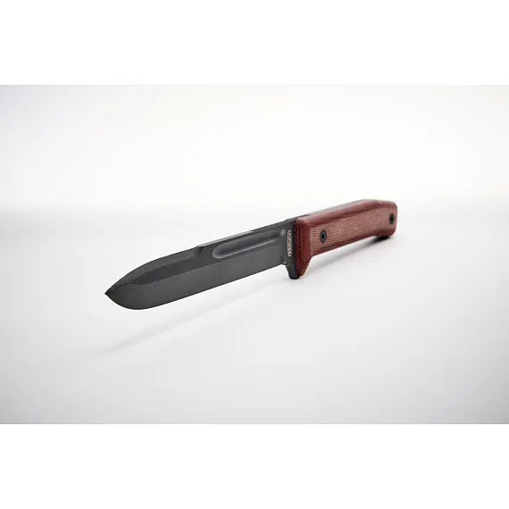 Micarta attachments are attached to the knife with two Allen screws. For better handling, the knife is equipped with a one-sided lower guard and roughening on the back of the blade for thumb support.