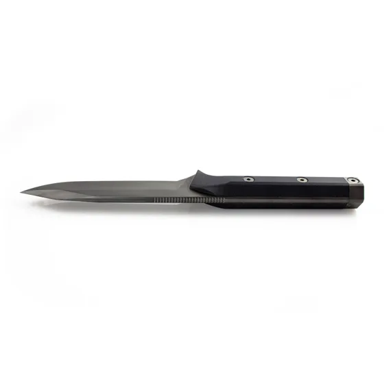 Handle - has a length of 128 mm and consists of 2 handles made of black G10 material, each with a thickness of 8.5 mm. Together with the blade, they form a robust handle with a thickness of 22 mm. This shape of the handle allows a firm grip in both the classic and reverse knife hold. The hexagonal shape of the handle symbolizes the pin that connects the individual parts of the tank belt. The front part of the handle symbolizes the front fender of the tank when viewed from the side