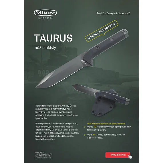 The TAURUS knife is from the Mikov company, which is based in the heart of Bohemian Switzerland in the town of Mikulášovice. affiliation and pride to this exceptional type of army. Therefore, the cooperation of the tank battalion commander, the author of combat knives Roman Hippík and technicians of the company Mikov s.r.o. a real uniqueness was created - a knife with timeless parameters, which will belong to the decorations of every soldier of the tank battalion. We offer the Taurus knife in two versions. The T0 version is intended exclusively for members of the tank battalion, the T1 version can be purchased by any knife lover and collector.