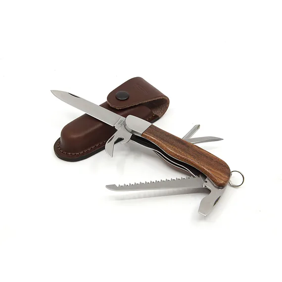 Čepel kapesního zavíracího nože HIKER je vyrobena z kvalitní nerezové oceli 420 o tvrdosti 53-55HRc. Tento kapesní zavírací nůž HIKER je vybaven kvalitní pilkou s dvěma řadami zubů, otvírákem na konzervy, křížovým šroubovákem, bodcem a otvírákem na láhve, který má drážku na odizolování vodičů nebo ho lze také použít jako plochý šroubovák. Kapesní zavírací nůž HIKER má kování a střenku vyrobenou z kvalitního exotického dřeva Palisandr. Kapesní zavírací nůž HIKER je také vybaven kroužkem pro uchycení a je dodáván v koženém pouzdře s logem Mikov.