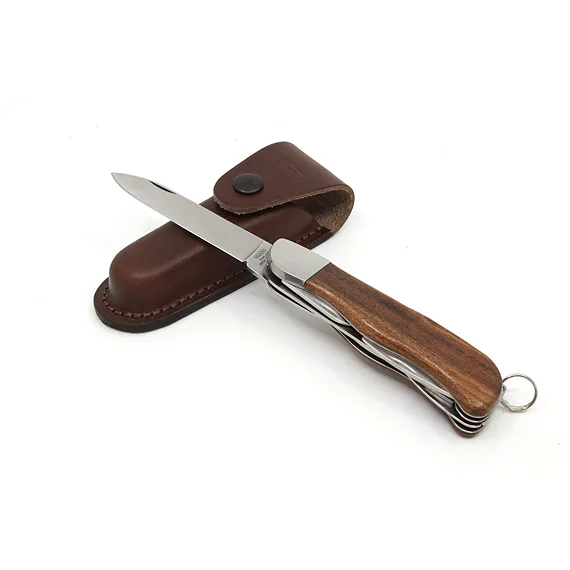 The blade of the HIKER pocket folding knife is made of high-quality stainless steel 420 with a hardness of 53-55HRc. This HIKER pocket folding knife is equipped with a high-quality saw with two rows of teeth, can opener, cross screwdriver, spike and bottle opener that has a groove for wire stripping or can also be used as a flat screwdriver. The HIKER pocket folding knife has fittings and a handle made of high-quality exotic rosewood. The HIKER pocket folding knife is also equipped with a ring for attachment and is delivered in a leather case with the Mikov logo. Number of functions: 7