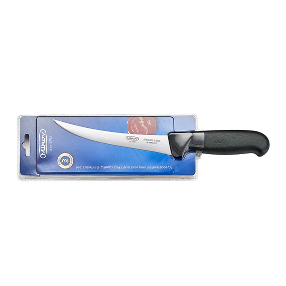 Kvalitní čepel s logem Mikov je vyrobena z kvalitní nerezové oceli 1.4116 (440A) o tvrdosti 55 – 58 HRc s vysokou řezivostí a otěruvzdorností osvědčenou pro výrobu řeznických a kuchyňských nožů. Je zasazena do plastové rukojeti, jejíž ergonomie umožňuje bezpečný a pohodlný úchop všemi prsty.