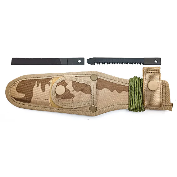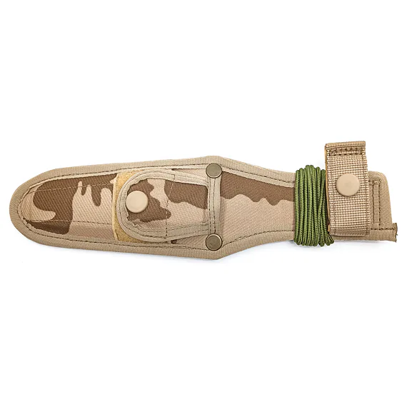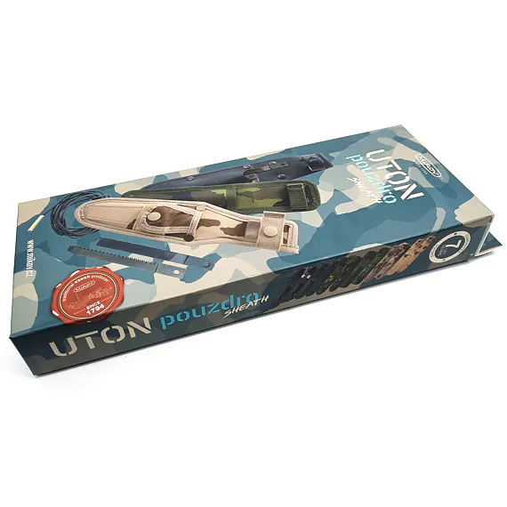 UTON 362-4 CAMOUFLAGE MNS CASE - textile camouflage case green with a pocket for accessories, modular support system for universal hanging of the case, including a metal plate preventing the dagger from falling out unintentionally. The case is equipped with a saw, a file and a green paracord cord.