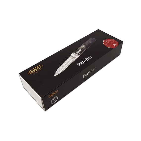 The knife looks luxurious and very elegant. Upon the customer's request, it is possible to produce PANTHER in a left-handed version, and it is also possible to engrave a logo or lettering on the blade. Each PANTHER is produced in a one-tool design only and comes with a luxurious leather case with a belt loop. Mikov equips each knife with a certificate, which confirms the originality of the product, the quality of materials and guarantees that the knife is handmade.